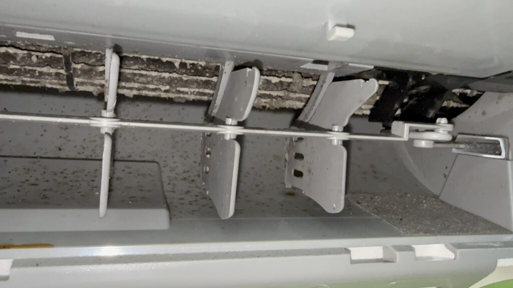 🟥 洗浄前:フィルター掃除機能が付いていても内部にはホコリ・カビが蓄積し、異臭や風量低下の原因に