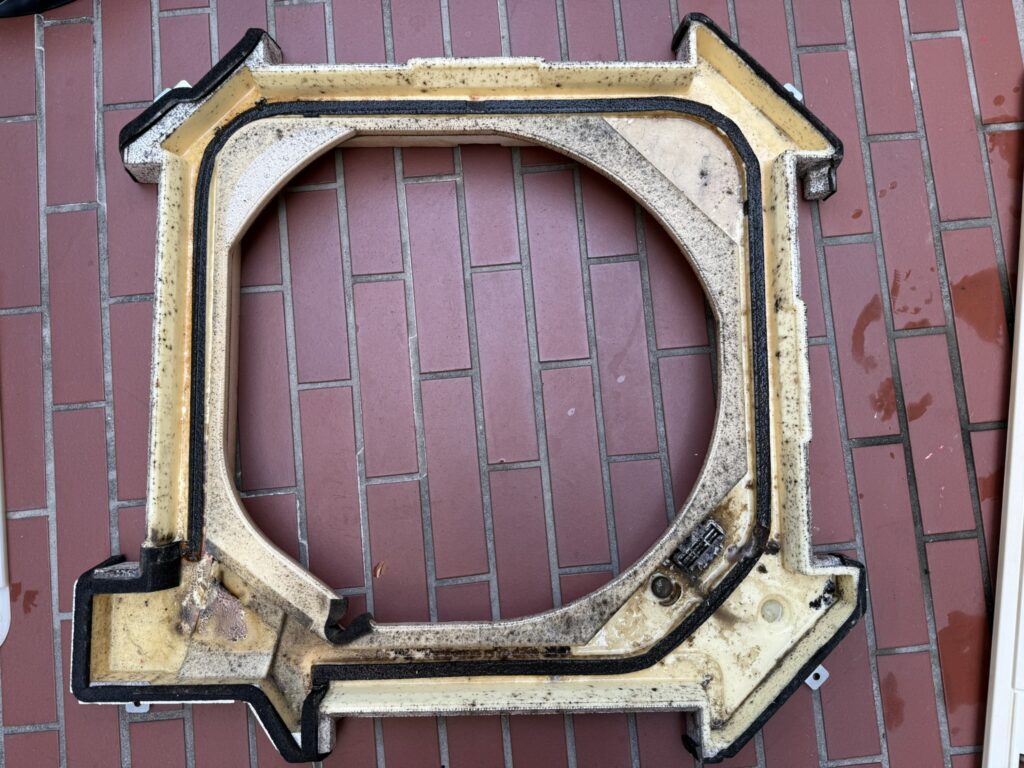 🟥 洗浄前:長年のヤニ汚れで内部が黒ずみ、風量低下