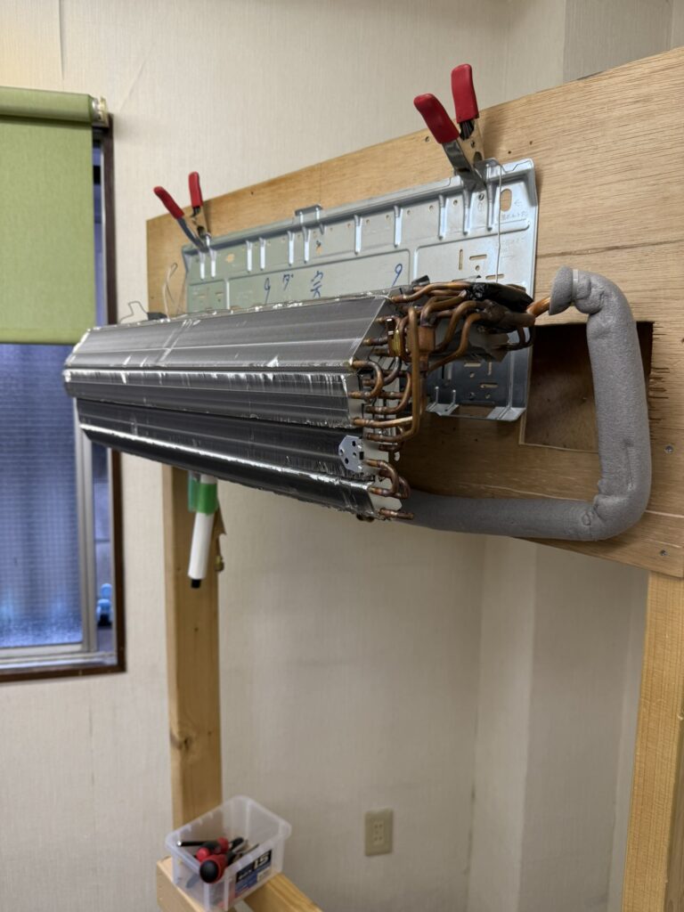 熱交換器(エバポレーター)を背板にワイヤーで固定し、